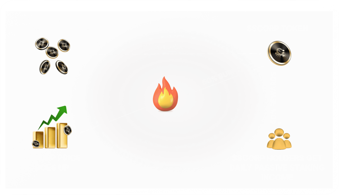 The smart contract automatically burns half of the purchased $SCORP tokens each day. This process reduces the circulating $SCORP supply, which makes the remaining tokens more valuable.